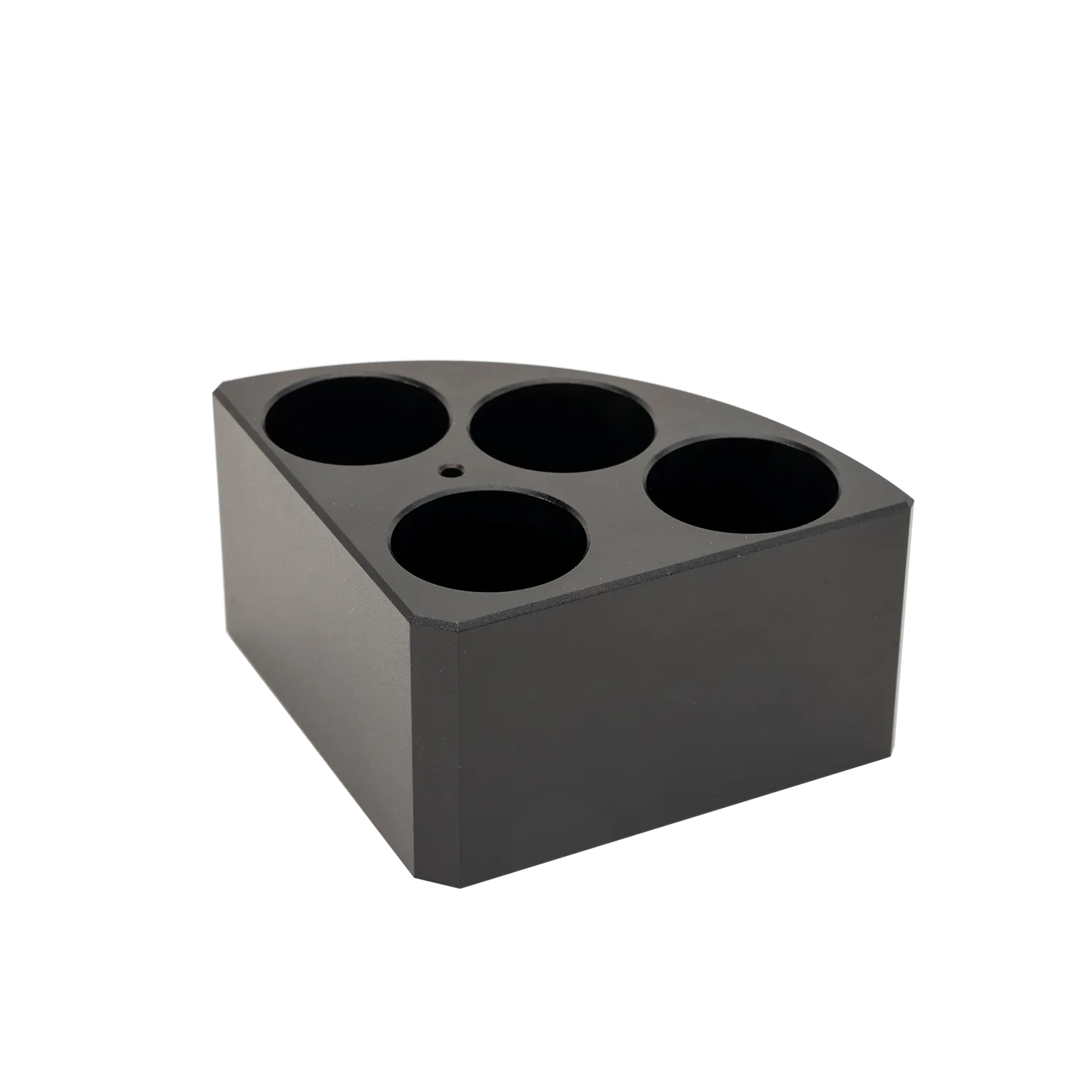 The DLAB Black Quarter Pie (Cat No. 18900005) is a precision?manufactured laboratory accessory used as a reaction block for heating and processing multiple samples simultaneously. It features four evenly spaced holes sized to accommodate 40?mL vessels with a diameter of approximately 28?mm and a depth of 43?mm, providing stable placement and efficient heat transfer during experiments. The black finish and robust construction ensure excellent chemical resistance and durability under frequent use. This quarter pie block is ideal for laboratory workflows requiring parallel processing of samples in dry baths, heating blocks, or similar thermal devices.