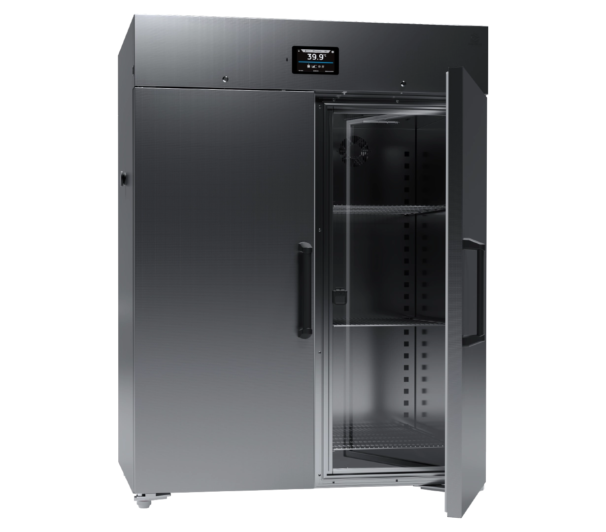 Durable Construction for Large Loads: Built for the rigors of industrial use, the chamber interior is crafted from acid-proof stainless steel (DIN 1.4301). The double-door design features solid, insulated outer doors for thermal efficiency and internal glass doors for sample inspection without microclimate disruption. The unit is mounted on heavy-duty castors with brakes, ensuring that despite its size, it can be positioned easily within the laboratory.