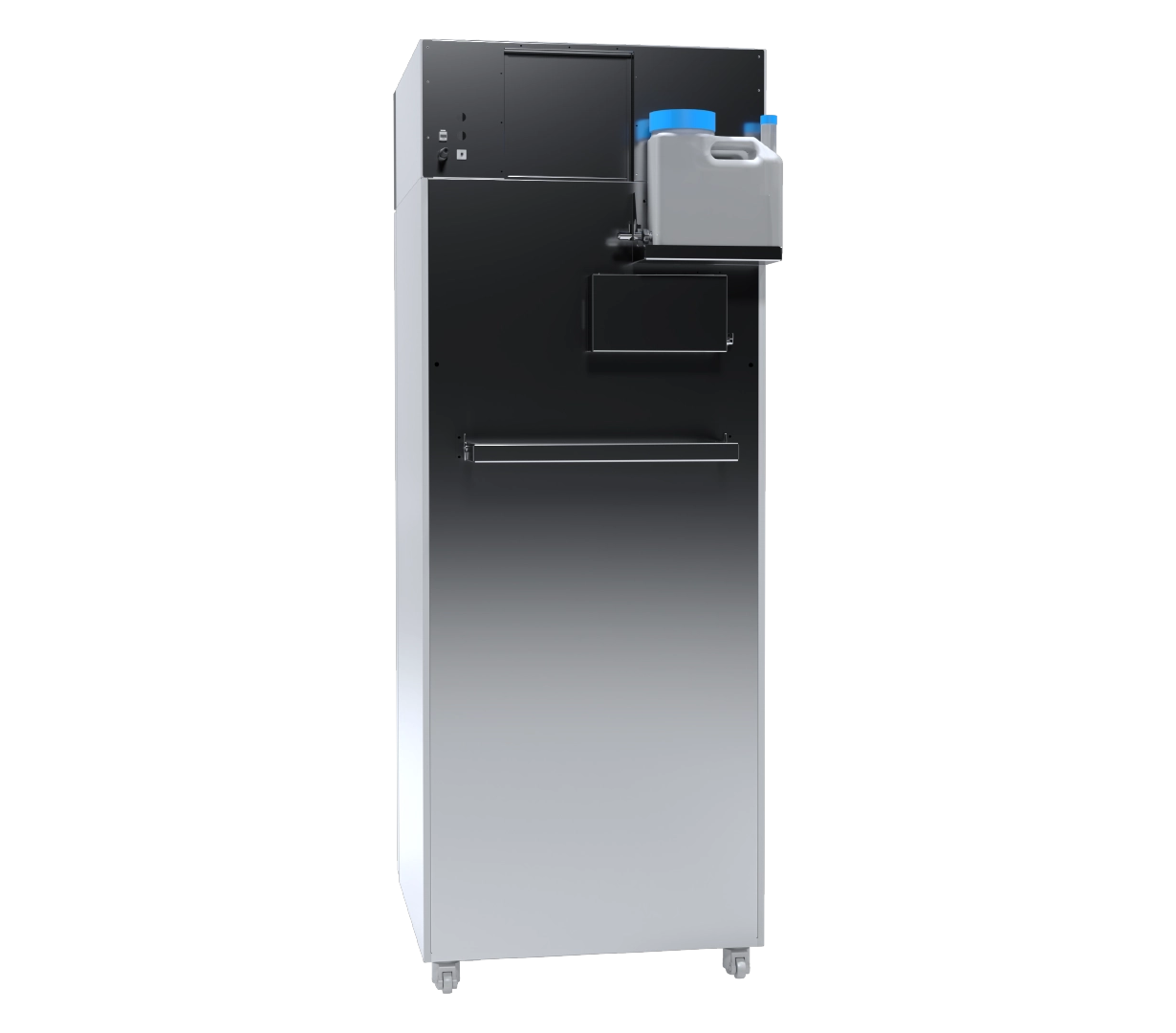 Heavy-Duty Construction The interior is built from acid-proof stainless steel (DIN 1.4301) to handle constant humidity. The double-door system (solid outer door with a lock and an internal glass door) ensures minimal atmospheric disruption during sample inspection. The unit sits on heavy-duty castors with brakes and includes a ?30 mm access port on the left side for external sensors.