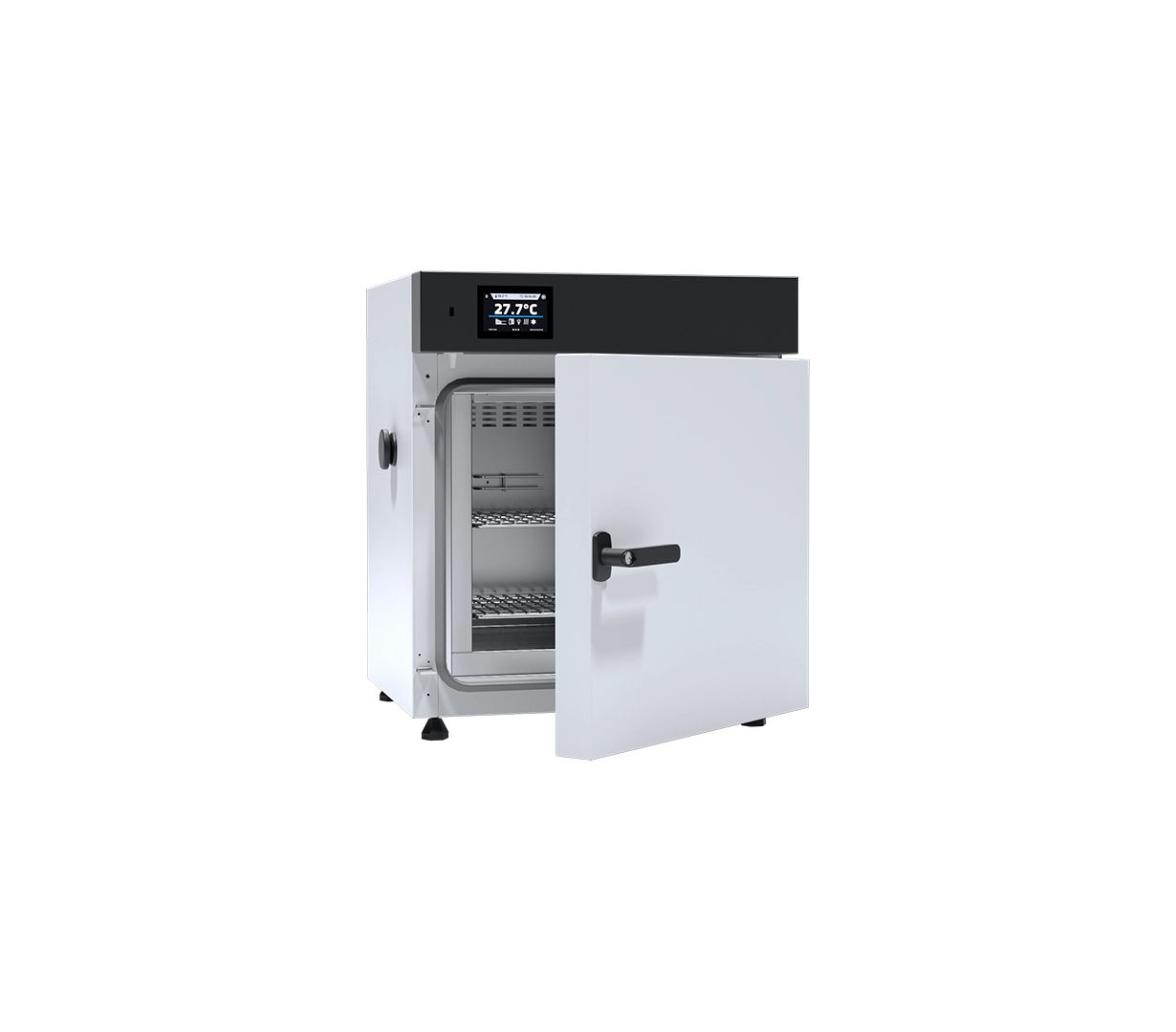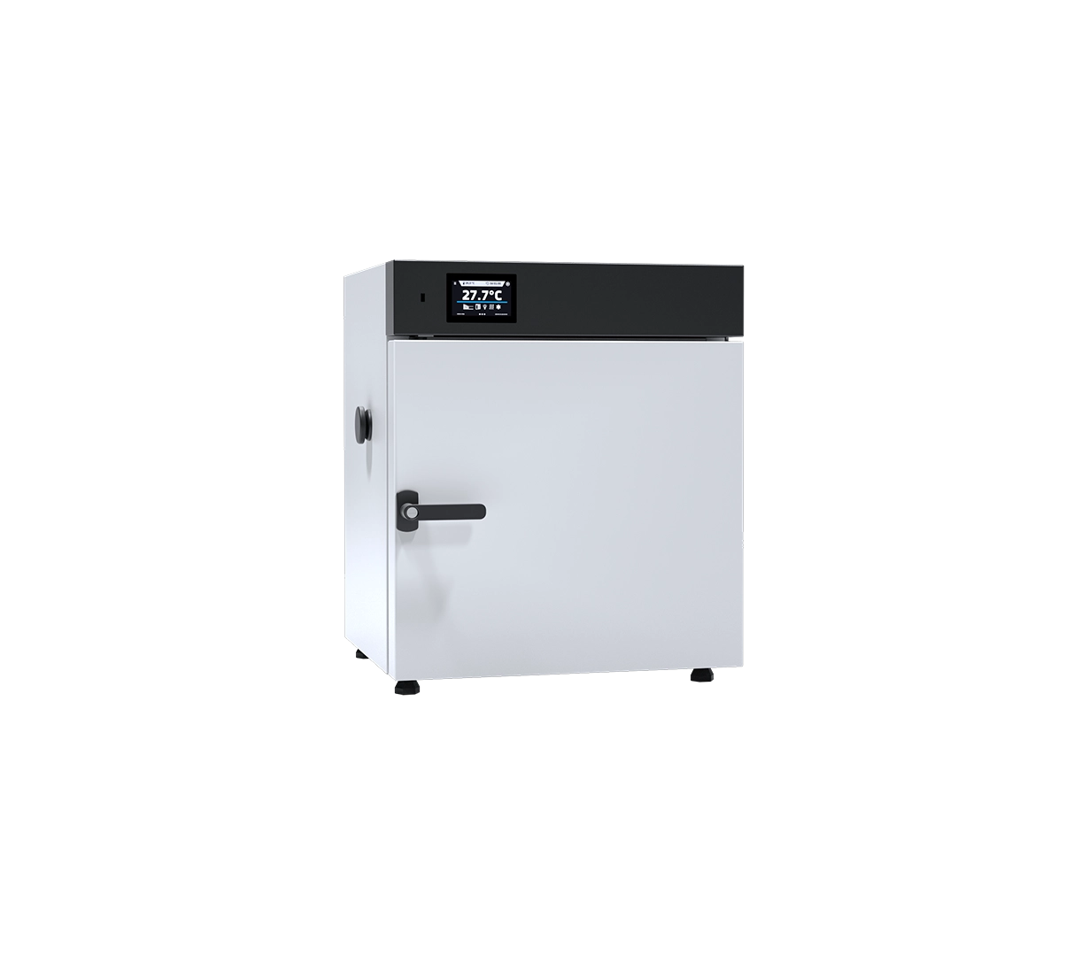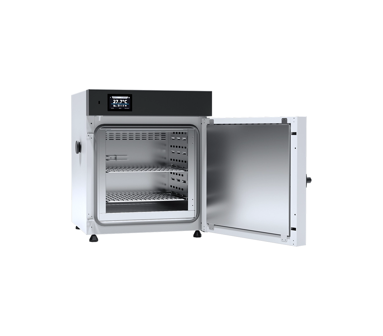 The POL-EKO SLN 53 is engineered for versatility and precision in everyday laboratory workflows. Its 56-liter internal capacity offers ample space for standard laboratory loads while maintaining a compact footprint suitable for benchtop installation.7 The Natural Convection (N) system is the defining feature of this model; by relying on gravity and thermal buoyancy rather than a fan, the oven prevents the dispersal of fine powders or the disturbance of delicate materials.8 This also results in exceptionally quiet operation, making it ideal for smaller shared laboratory spaces.+1Advanced Control and Data Integrity:Managed by the Smart controller, the SLN 53 brings advanced automation to thermal processing:9User-Friendly Interface: The 4.3-inch color touchscreen is easy to navigate and can be operated while wearing laboratory gloves.10Complex Programming: Users can set multi-segment temperature-time profiles, including adjustable ramps and loop functions (up to 255 times or endless).11Safety & Security: The unit includes Class 2.0 over-temperature protection (DIN 12880) and an open-door alarm.12 Access control is managed through user passwords, and a physical door lock is standard.13Connectivity: Integrated USB and LAN ports facilitate the export of data logs and event registries, supporting GLP-compliant documentation.14Industrial-Grade Construction:The chamber is manufactured from acid-proof stainless steel (DIN 1.4301), ensuring durability even under continuous use at 15$+300^{circ}C$.16 The unit features an adjustable 17$emptyset$40 mm air-flap for moisture removal and a dedicated access port (18$emptyset$30 mm) for external temperature sensors.19 The exterior is available in standard powder-coated sheet metal or the “linen finish” stainless steel (IG version) for enhanced chemical resistance.20+2Primary Applications:General Drying: Moisture removal from laboratory glassware, wires, and tools.21Sample Preparation: Precise drying of plant tissues, drug metabolism samples, and paper.22Material Testing: Aging tests, curing of electronic components, and thermal resistance analysis of building materials.23Biotech/Pharma: Digestion of proteins and preheating of specialized equipment.24