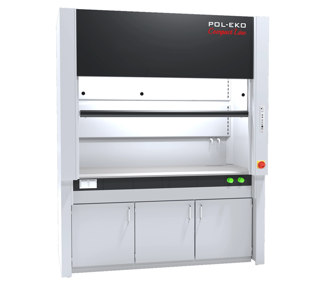 POL-EKO Fume Hood CompactLine DCL 1800 CR The DCL 1800 CR is a premium 1.8-meter wide laboratory fume hood engineered for demanding chemical environments. It features a robust galvanized steel structure, a monolithic ceramic worktop with a raised marine edge, and Buchtal ceramic internal walls. Equipped with a Schneider air-flow monitoring system (EN 14175 compliant), a dual-exhaust back wall system, and energy-saving LED lighting, it provides a safe, acid-resistant environment for large-scale experiments. The unit includes integrated water and electrical utilities, a ceramic sink, and a counterbalanced toughened glass sash with additional sliding panes.