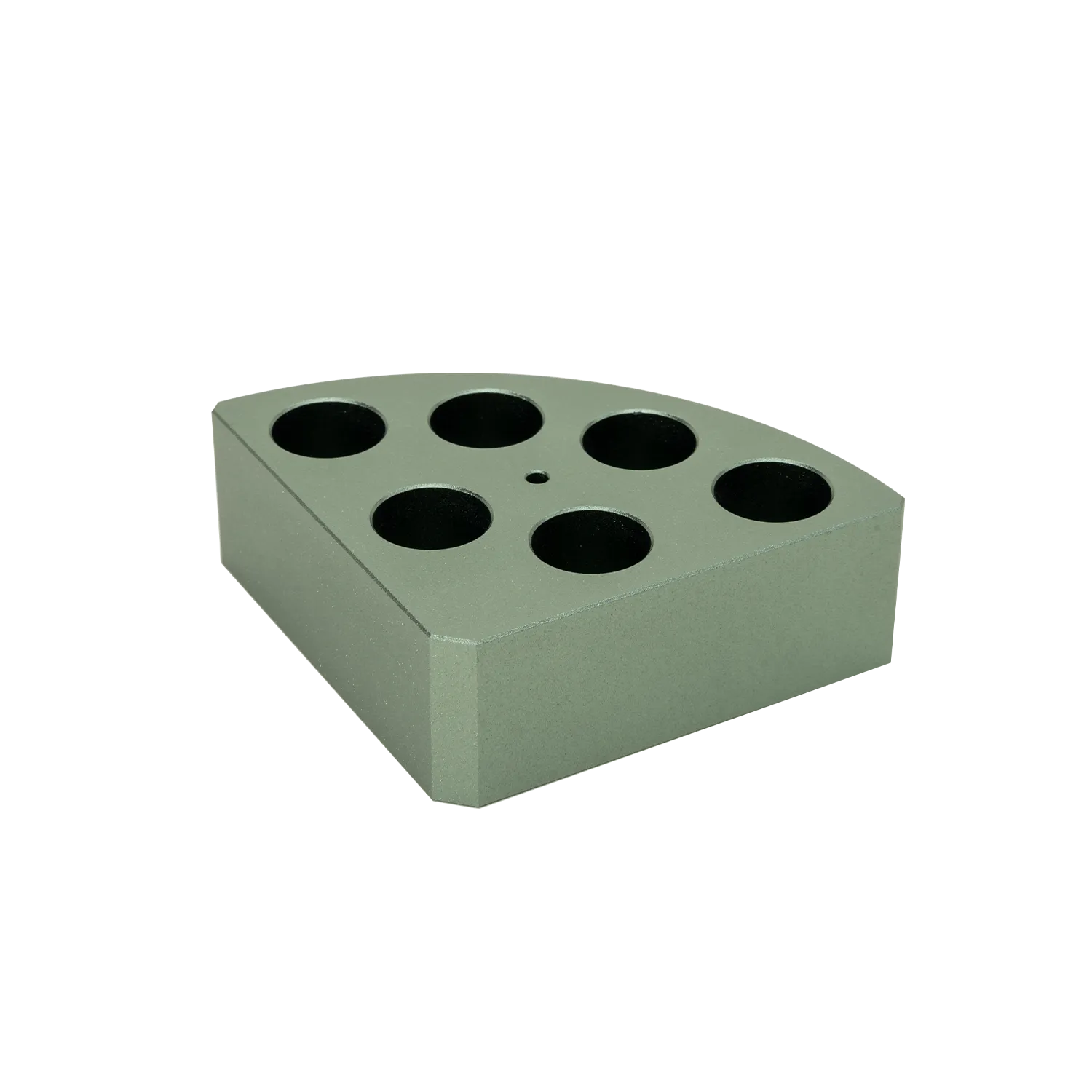 The Green Quarter Pie is a specially designed lab accessory that securely holds up to six 8?mL reaction vials, optimizing space usage and improving workflow efficiency in scientific experiments. Its precise hole dimensions and durable construction make it a practical solution for organized sample handling.