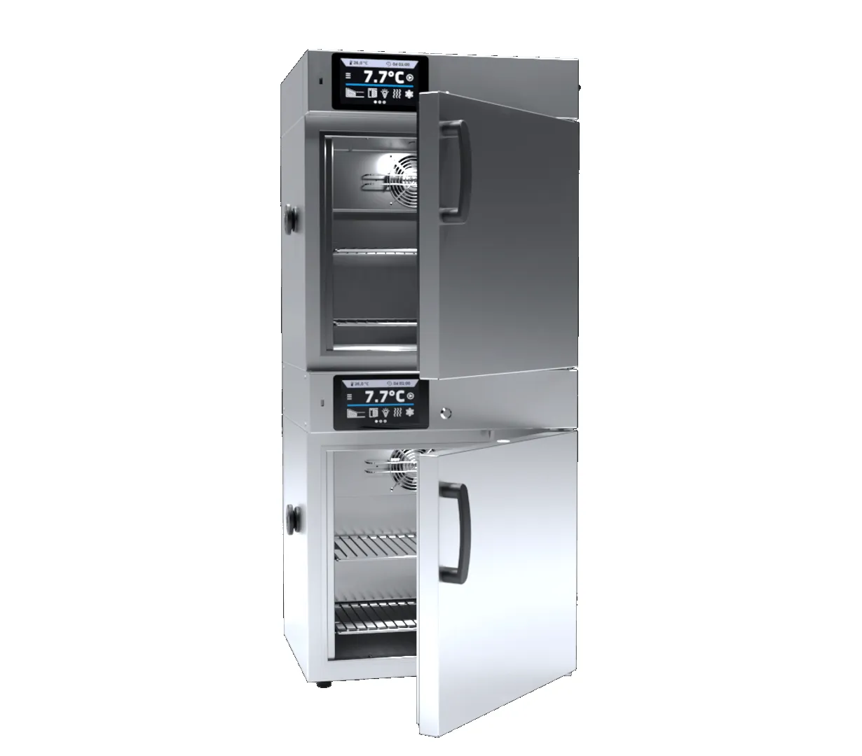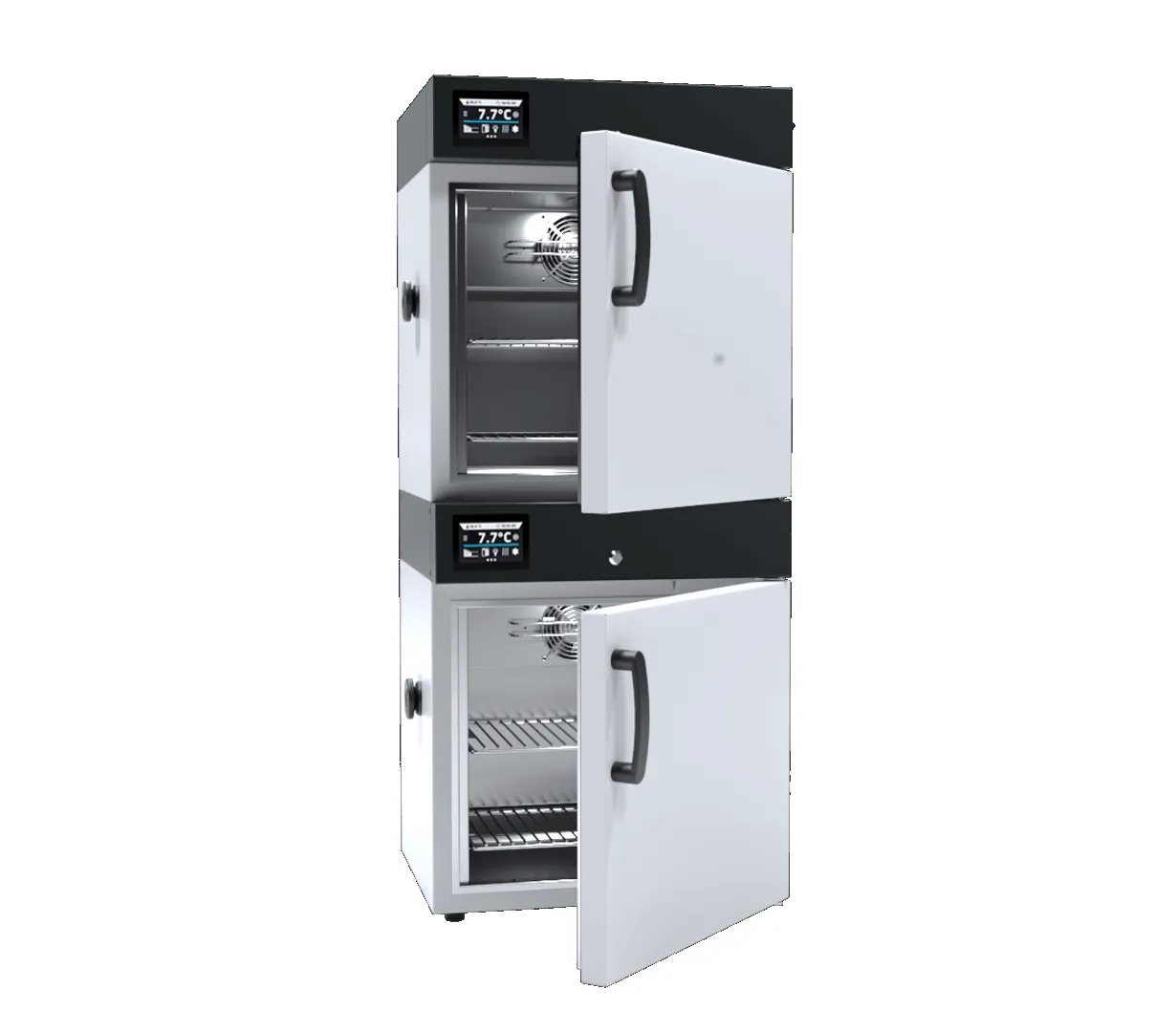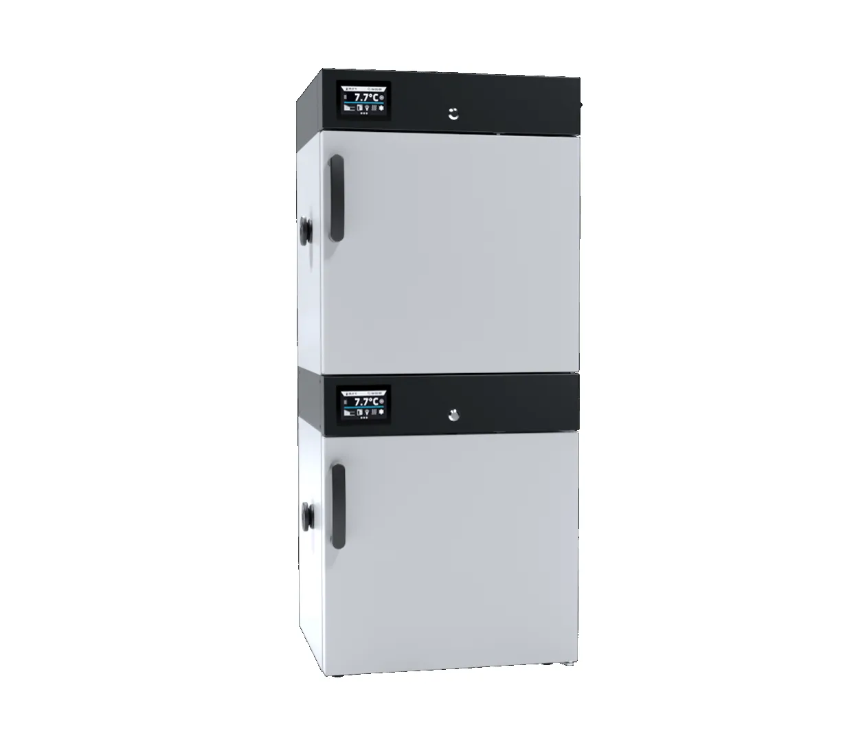 The CHL 1/1 is a multi-chamber laboratory refrigerator consisting of two independent 70-liter chambers stacked in a single vertical housing. Each chamber has its own separate controller and cooling system, allowing you to maintain different temperature settings or store different types of samples (e.g., reagents in one, vaccines in the other) within the same footprint.