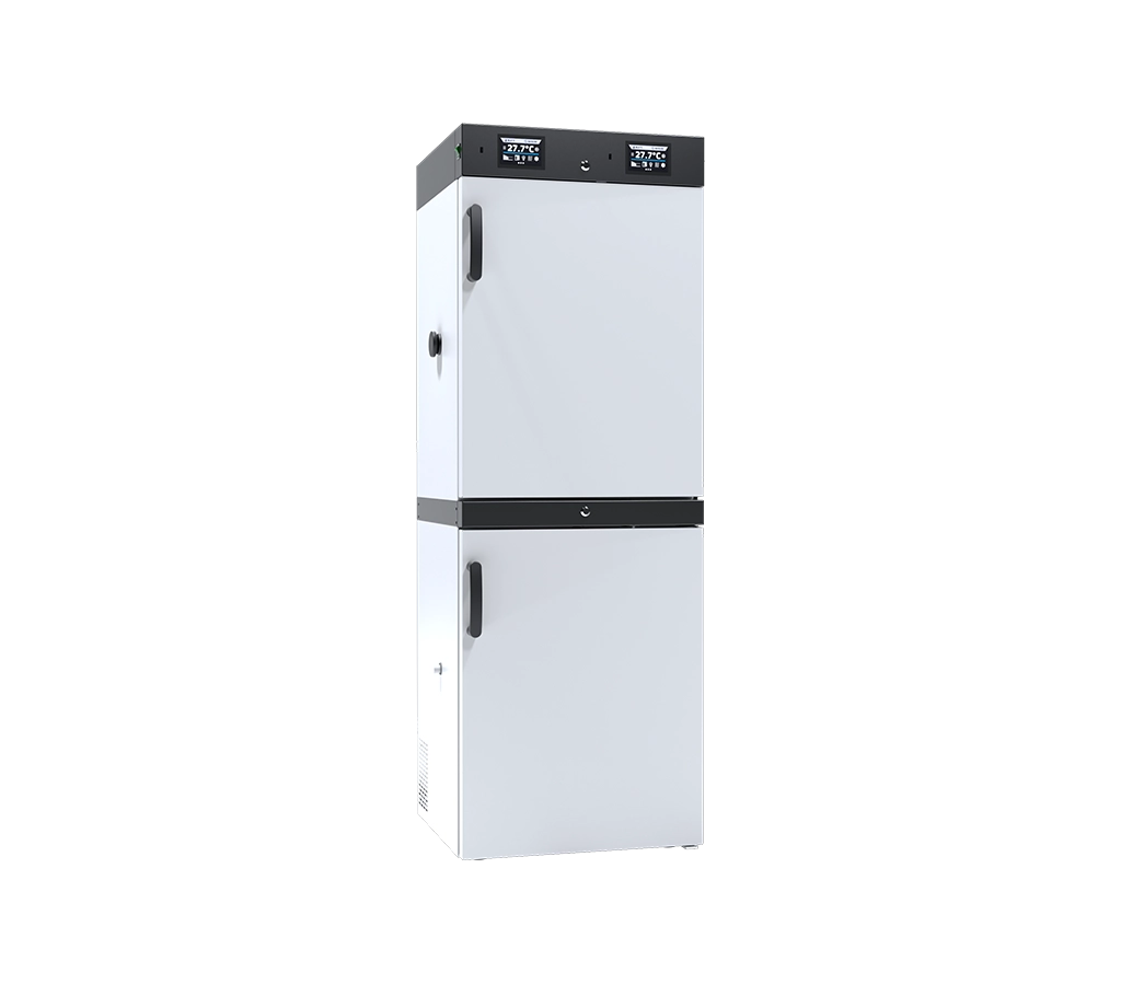 The CHL2/ZLN85 is a combined laboratory unit featuring a 150-liter refrigerator in the upper section and an 85-liter freezer in the lower section. This multi-chamber device is designed to optimize floor space while providing independent temperature control for refrigerated and frozen samples.